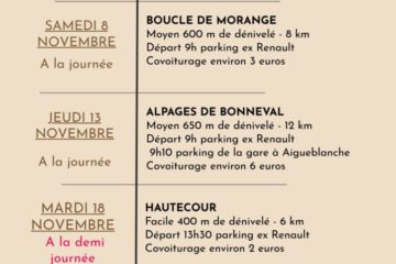 Randonnées novembre 2025 Randonnées octobre 2025 PAS D’INSCRIPTION : SOYEZ A L’HEURE Prévoir de bonnes chaussures, bâtons, cape de pluie et/ou lunettes de soleil selon la météo, et … votre bonne humeur !!