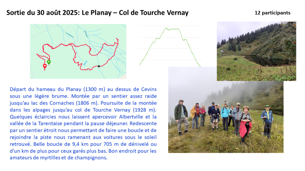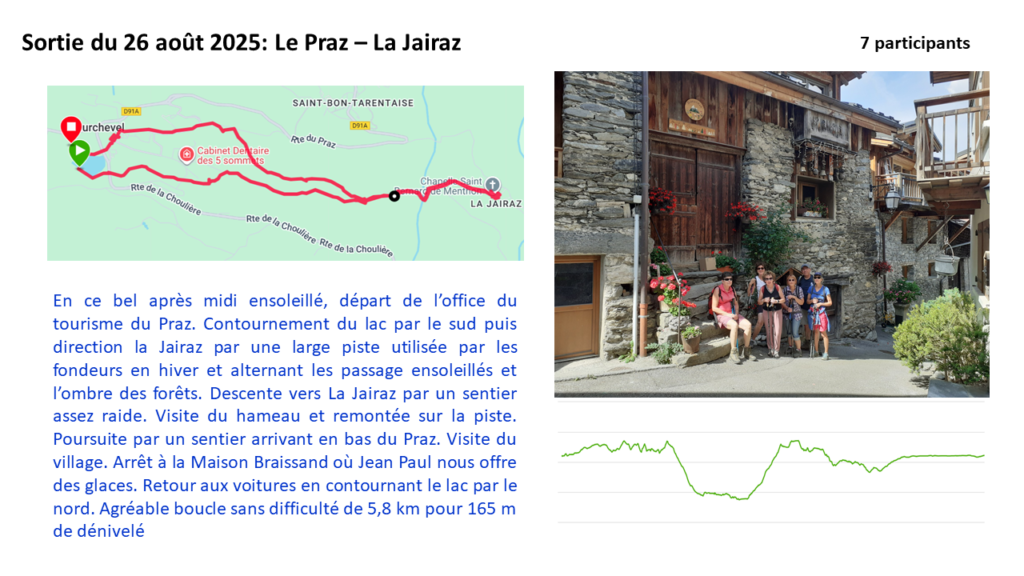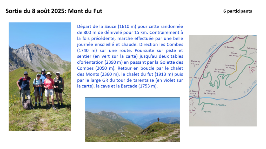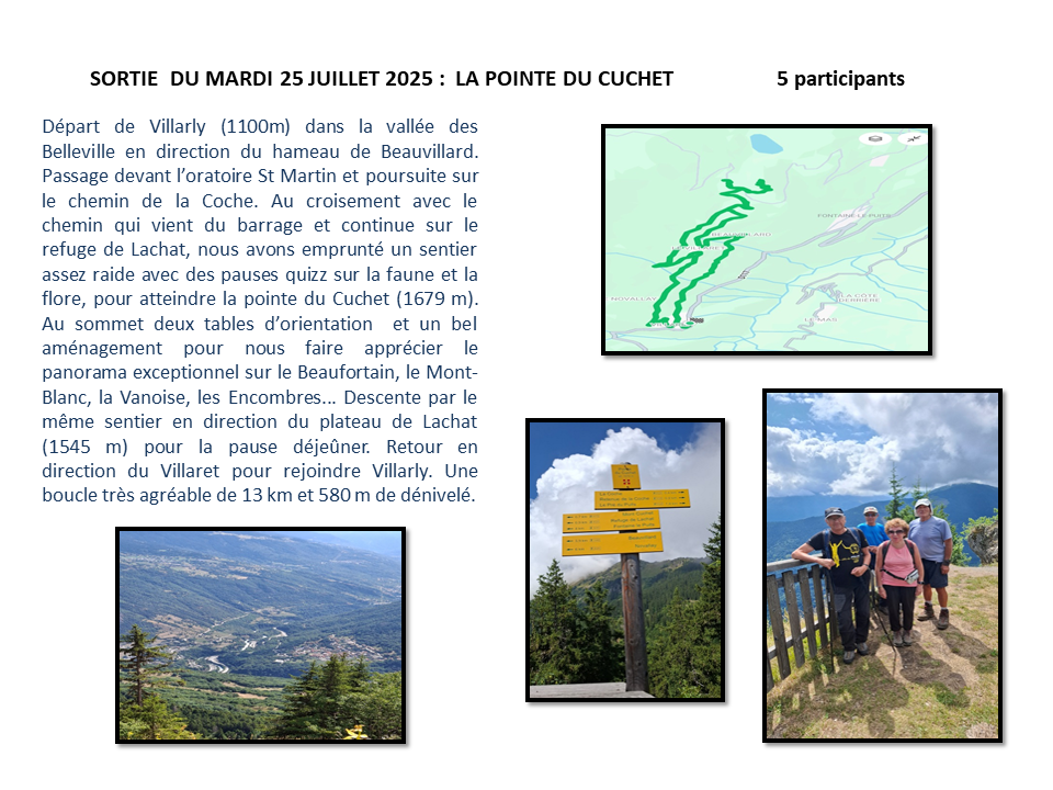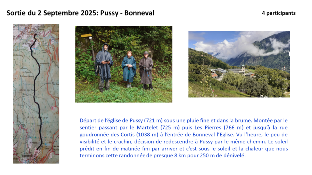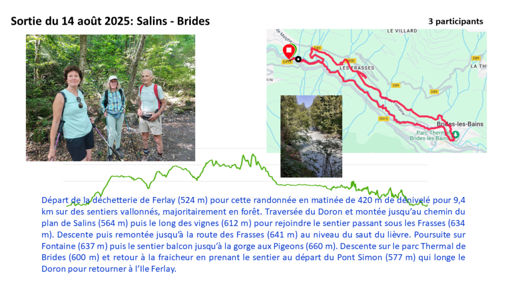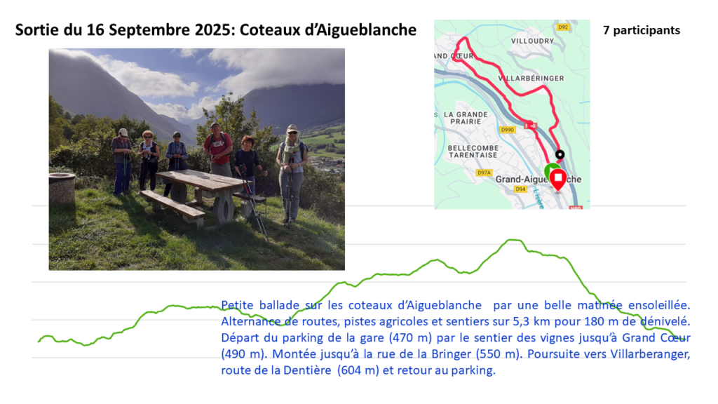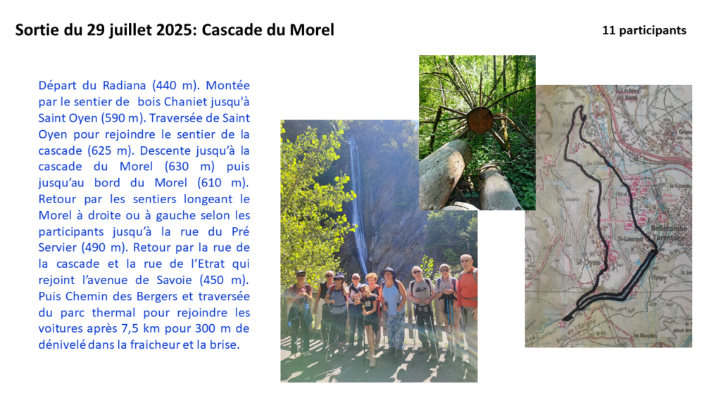 Le groupe, composé de 10 marcheurs, est partis du centre de Moutiers en direction de la Croix de Feissons. Quelques gouttes de pluie n’ont pas entamé le moral du groupe qui est arrivé à la Croix de Feissons et a pu se restaurer au soleil. Redescente ensuite par le village de Feissons/Salins, pour rejoindre ensuite Moutiers. Apparemment, le dénivelé, approche les 1000mètres, pour une un parcours, d’environ 16 Km.