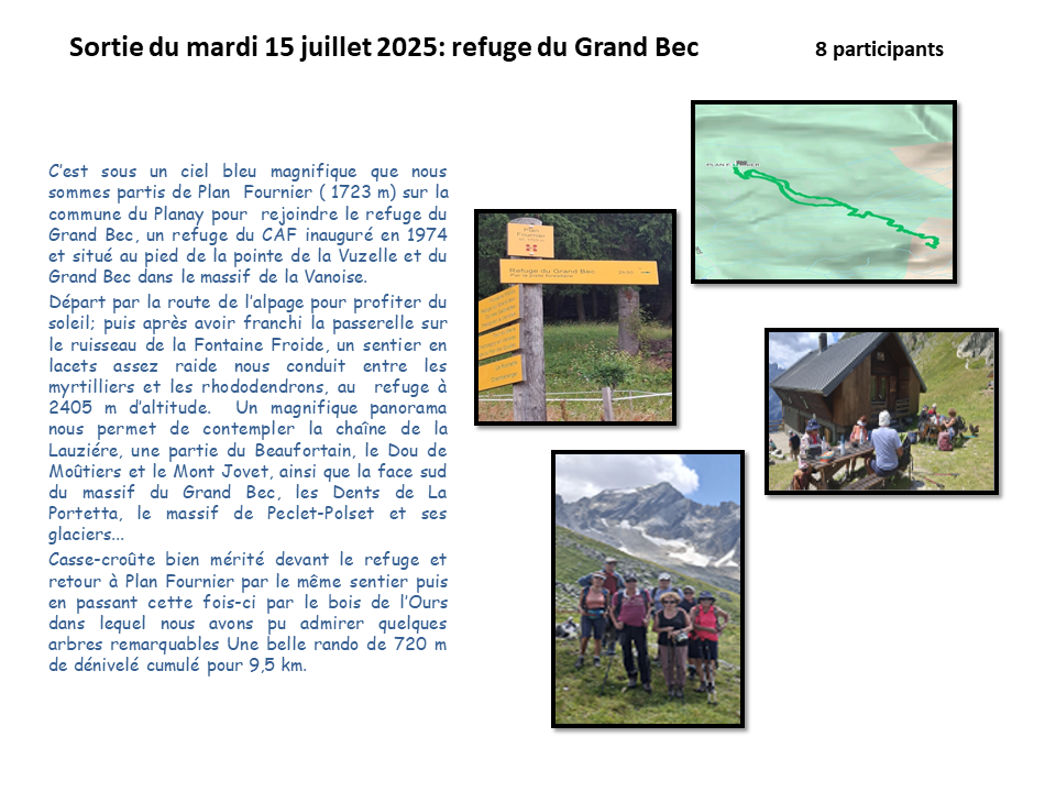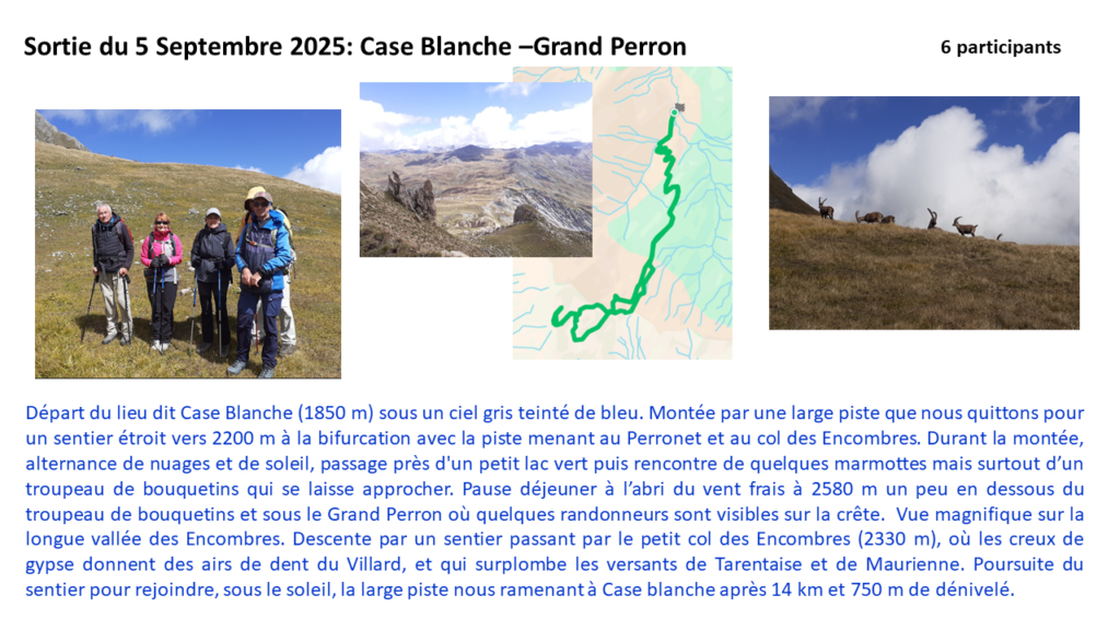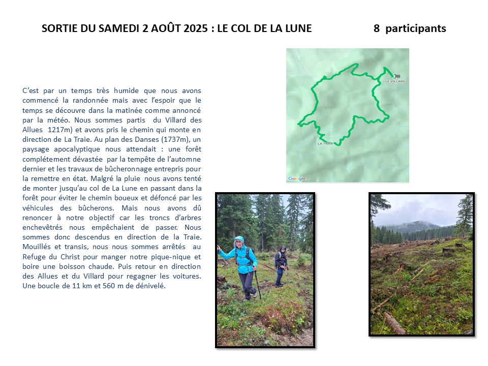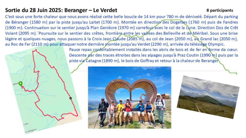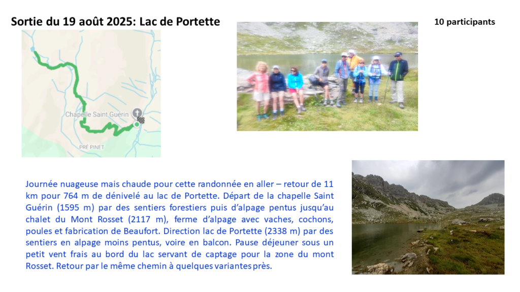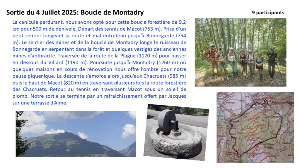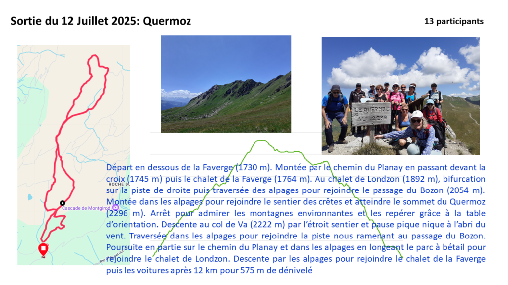 Le groupe, composé de 10 marcheurs, est partis du centre de Moutiers en direction de la Croix de Feissons. Quelques gouttes de pluie n’ont pas entamé le moral du groupe qui est arrivé à la Croix de Feissons et a pu se restaurer au soleil. Redescente ensuite par le village de Feissons/Salins, pour rejoindre ensuite Moutiers. Apparemment, le dénivelé, approche les 1000mètres, pour une un parcours, d’environ 16 Km.